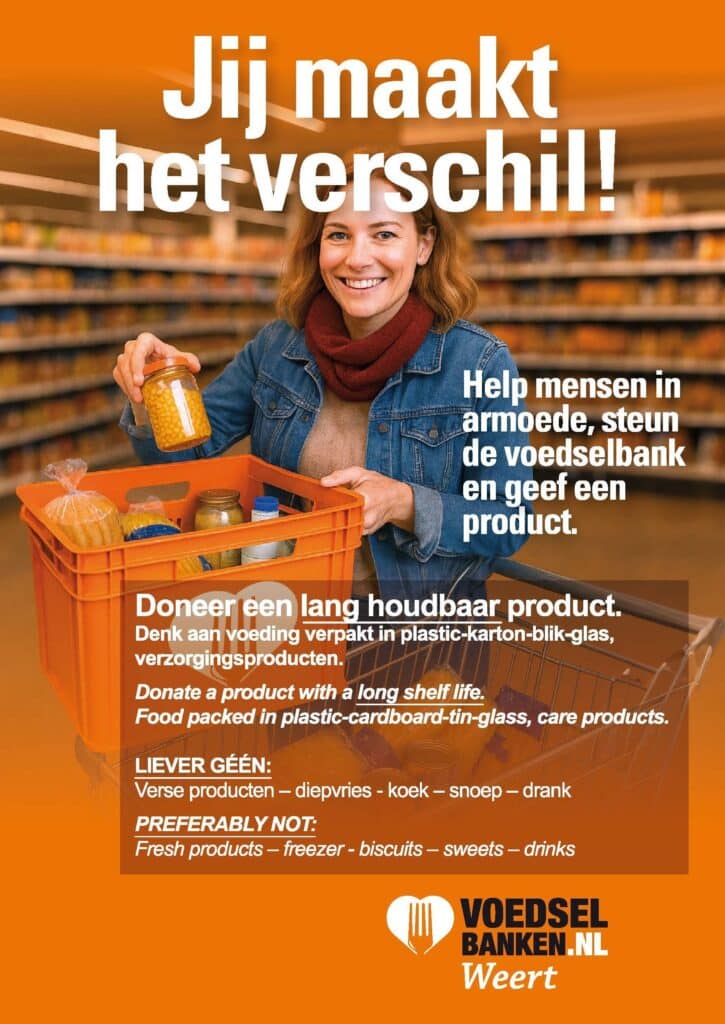 Op zaterdag 13 december is het weer zover: de jaarlijkse supermarktactie voor de Voedselbank in Weert, Nederweert en Cranendonck. Ook in deze tijd zijn er nog altijd veel alleenstaanden en gezinnen die afhankelijk zijn van een wekelijks voedselpakket. Voor de Voedselbank is het een grote uitdaging om aan deze groeiende behoefte te blijven voldoen. Juist daarom is deze actiedag van onschatbare waarde.